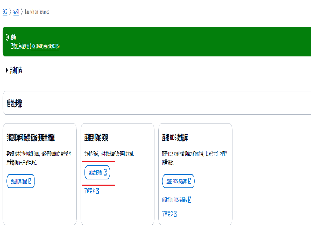 实例启动成功后会在页面中显示消息提醒,点击链接到实例按钮即可连接到实例进行下一步部署。