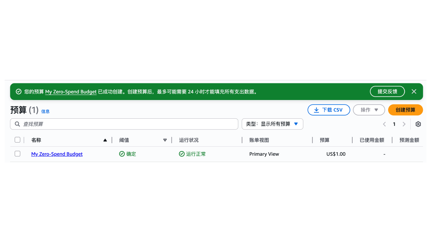 创建预算,选择默认预算设置 – 使用模版(简化),按照默认“零支出预算”,输入预算名称,电子邮件收件人(多个邮件地址用逗号隔开)后,点击“创建预算”。