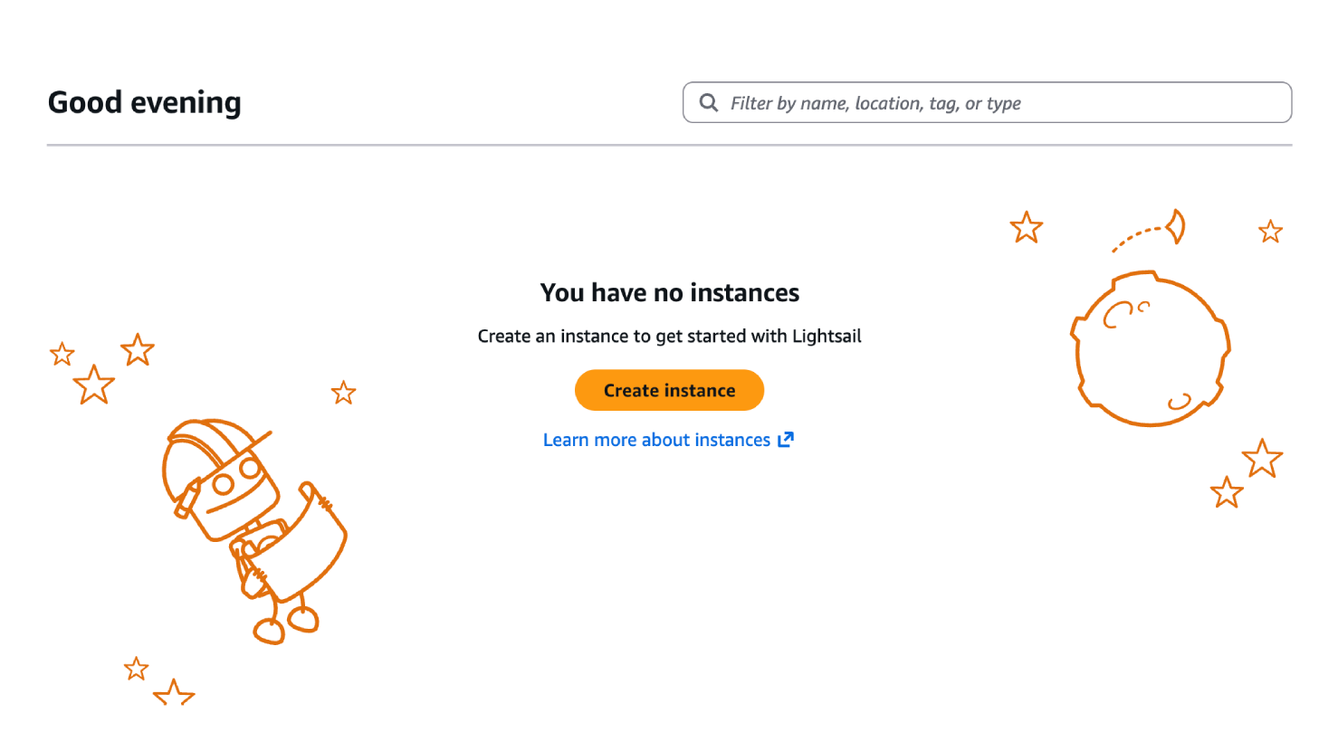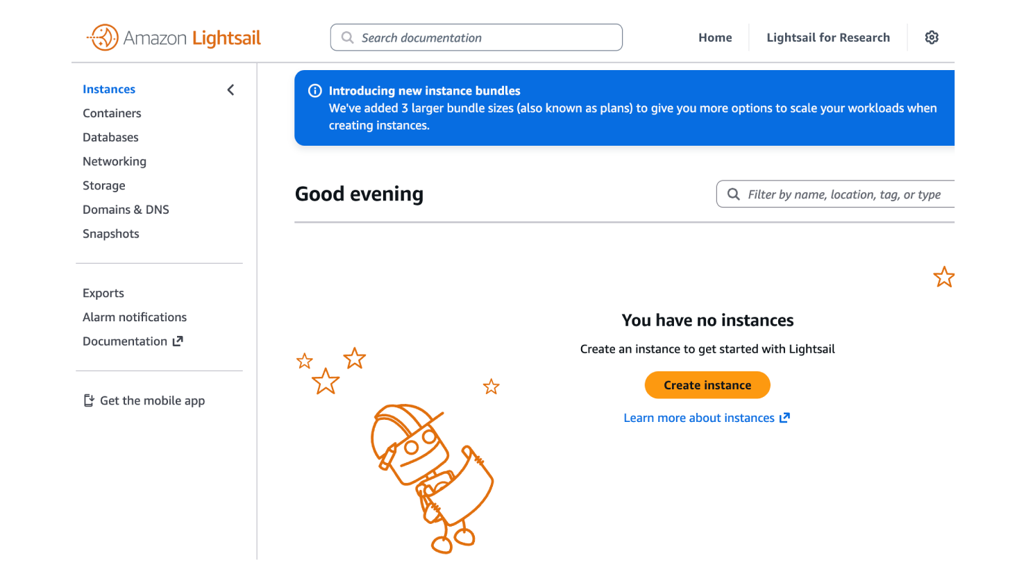 此时,重新打开 Lightsail 控制台,点击“Create instance”(创建实例)。