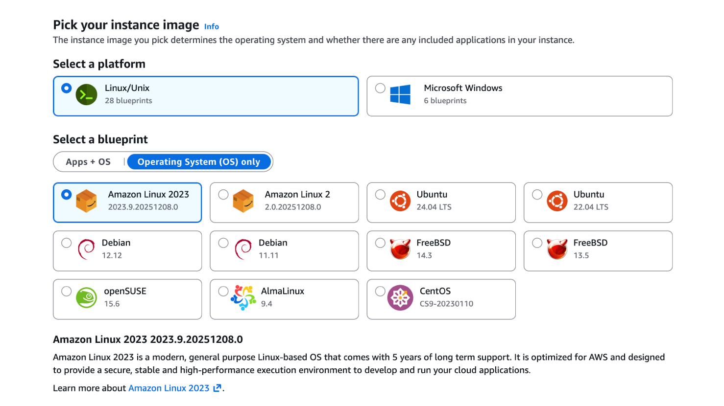 选择平台按照默认的 Linux/Unix,在 Select a blueprint 部分,点击”Operating System (OS) only“(仅操作系统)。