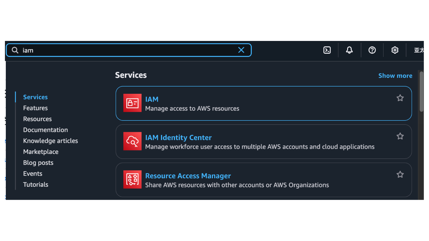 在控制台搜素栏中,搜索关键字”iam”,用来访问 IAM 服务。