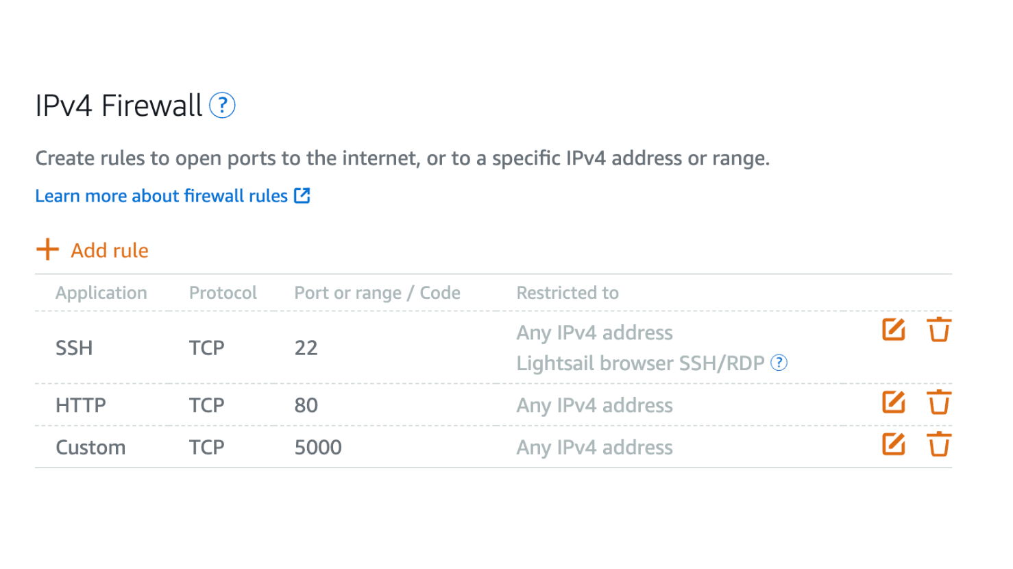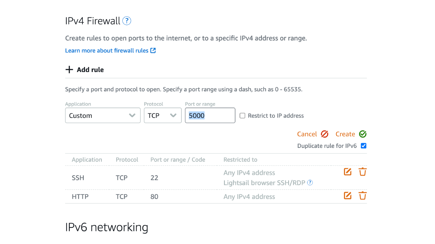 在 IPV4 Firewall 部分,点击”Add rule”(增加规则),选择 Application 下拉菜单“Custom”,Protocol 为“TCP”,Port or range(端口或范围)为”5000”,点击“Create”完成规则创建。