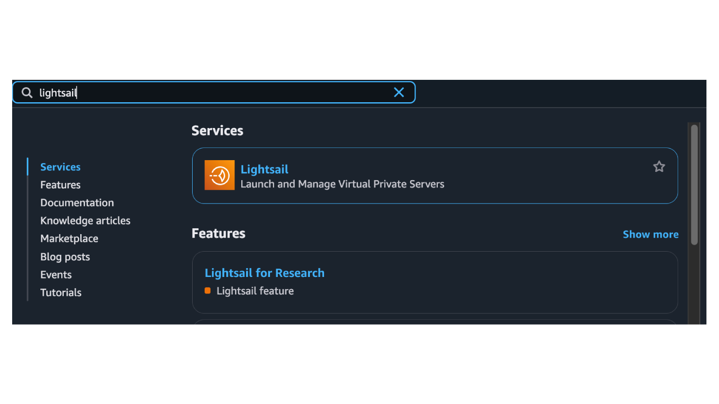 全部打开在管理控制台页面搜索服务”Lightsail”.