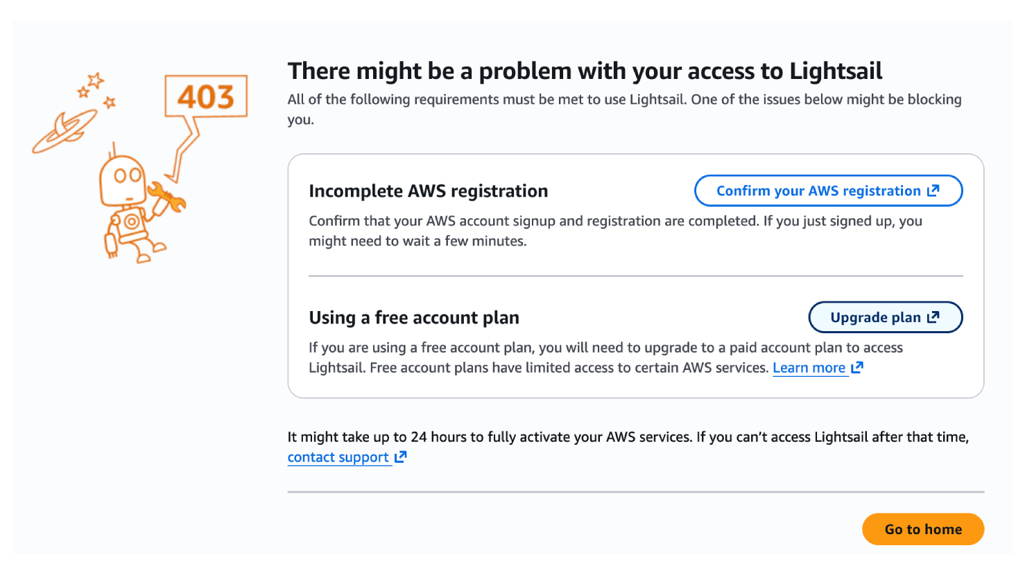 控制台页面显示“访问Lightsail可能出现了问题“。