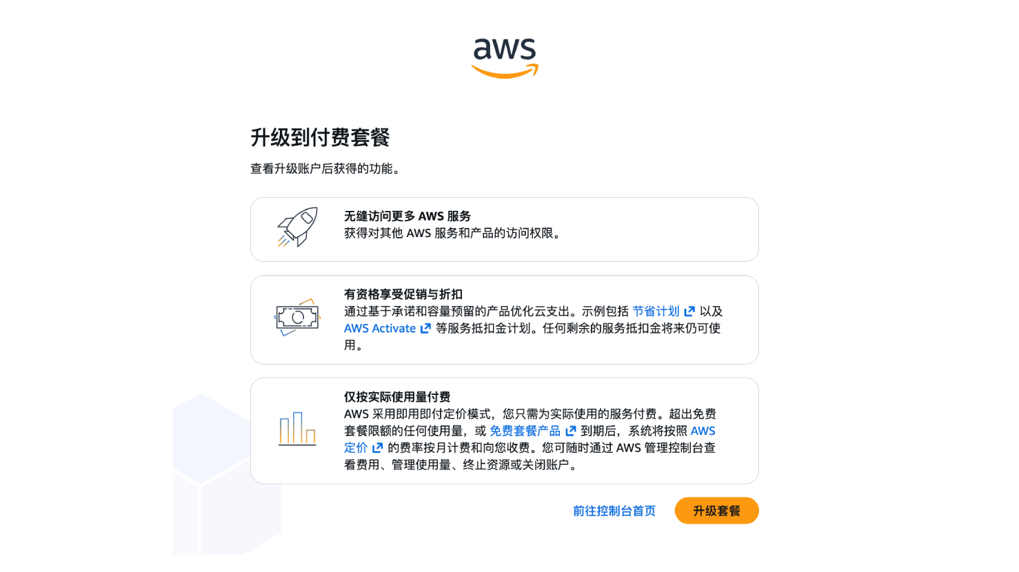 *注意:由于升级到付费套餐计划,因此,返回控制台主页面时,建议打开Cost Explorer(成本资源浏览器)。