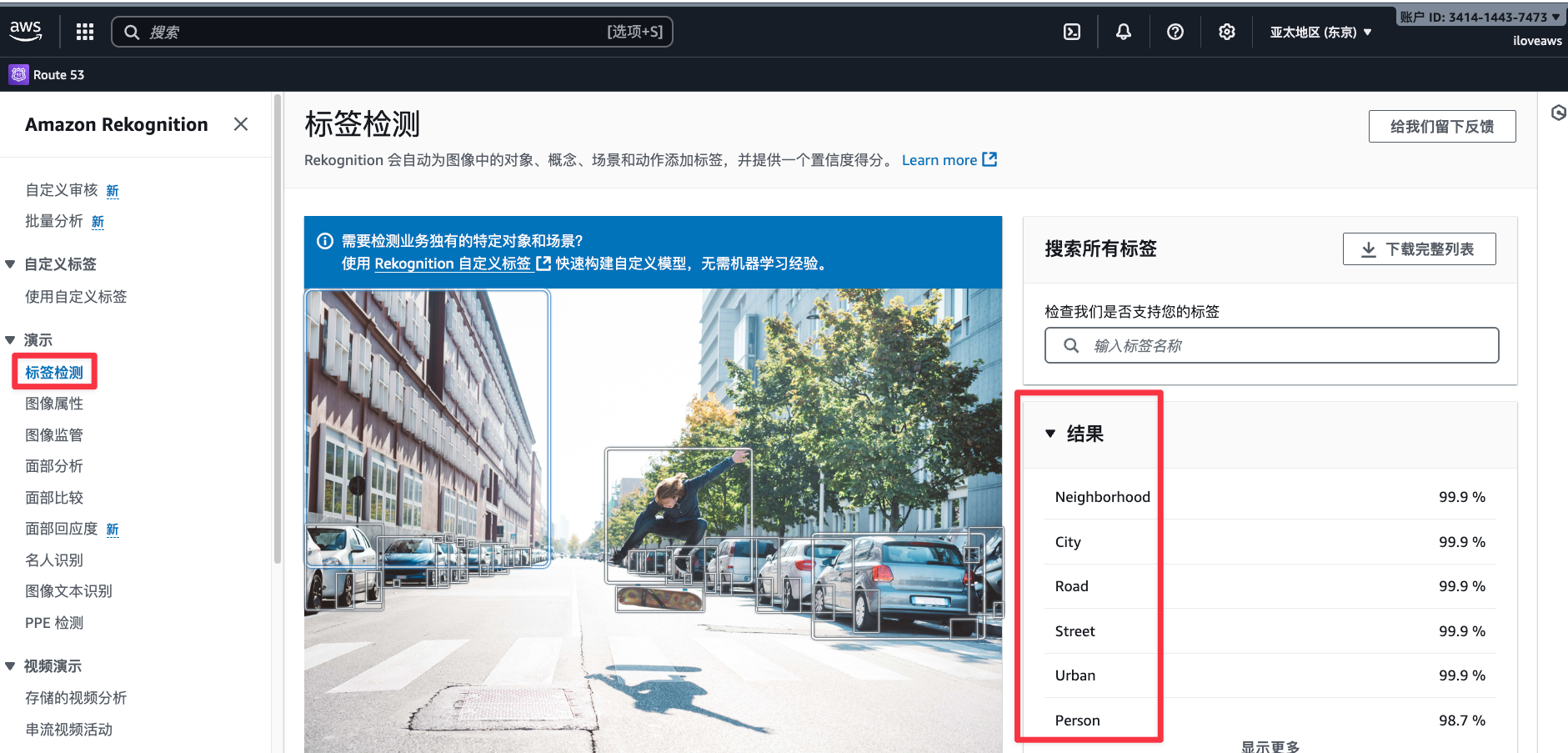 - 您会看到一个演示界面,左侧是一张默认的城市风景样本图片,右侧是 Rekognition 已经分析出的结果。