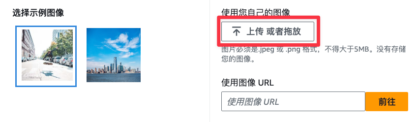- 在演示图片的下方,您会看到一个“使用您自己的图像”区域,然后有一个“上传或者拖放”按钮。点击它。