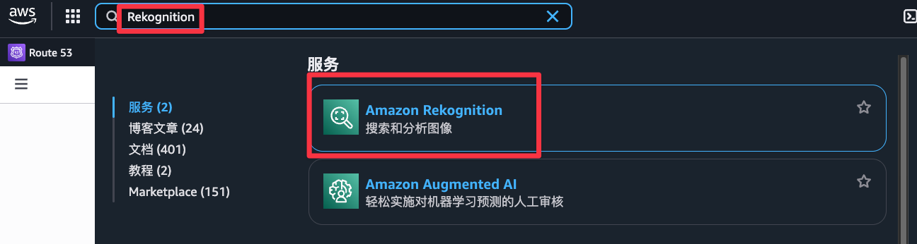 - 在控制台顶部的搜索框中输入 Rekognition 并回车。