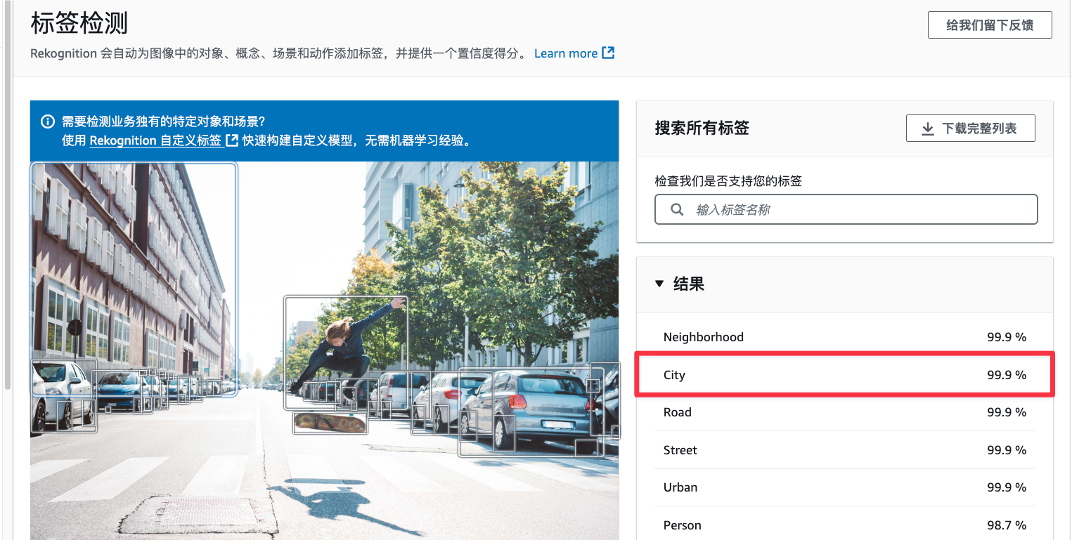 - 您会看到一个演示界面,左侧是一张默认的城市风景样本图片,右侧是 Rekognition 已经分析出的结果。