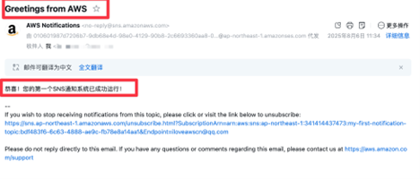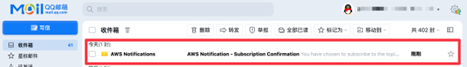 打开您刚刚填写的邮箱的收件箱。您会收到一封来自“AWS Notifications”的邮件,主题通常是 “AWS Notification - Subscription Confirmation”。