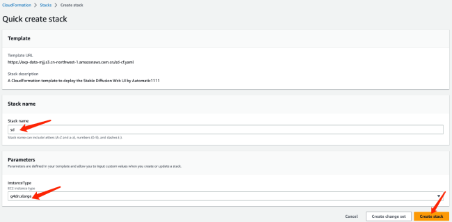 全部打开在此步骤中,您将利用 CloudFormation 一键式部署 StableDiffusion 的 AI 方案。EC2 机型默认使用 g4dn.xlarge。