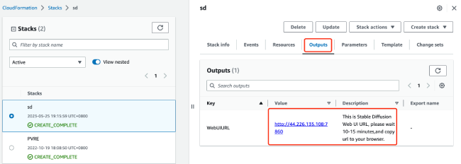 全部打开堆栈构建完成后,在 “sd” 堆栈的 “Outputs” 选项中,会生成 URL,在拿到该 URL 后,由于部署需要底层实例环境的初始化,需要等待 10-15 分钟的时间,然后复制 WebUI 的 URL 到浏览器中,如果出现 “无法访问此网站” 提示,表明 EC2 初始化还未完成,请再稍等几分钟后刷新页面。