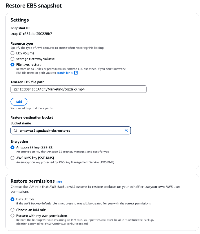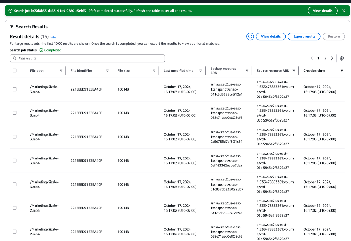 你可以选择恢复单个或多个文件。在此示例中,我们选择恢复“Sizzle-3.mp4”这个文件,如图 6 所示。在恢复过程中,AWS Backup 不会覆盖原始文件,而是将恢复后的文件下载到你之前创建的 Amazon S3 存储桶。如果恢复目标是 Amazon S3 对象,你可以将对象恢复到原来的源存储桶或其他存储桶。如果恢复至同一存储桶,恢复的对象会与原来的 Amazon S3 对象并存。