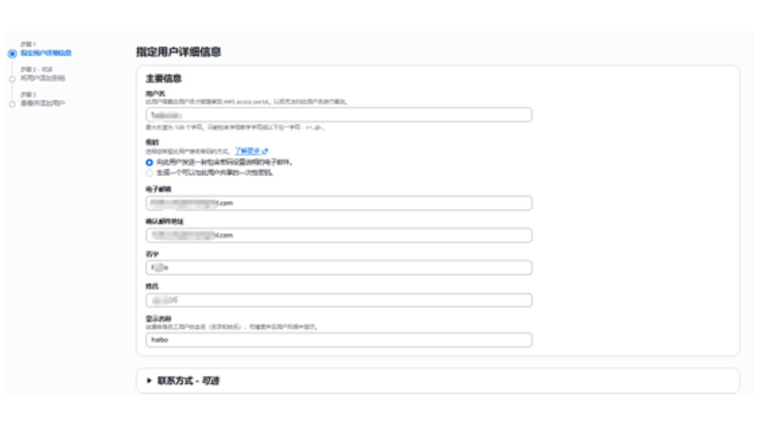 全部打开在添加完用户之后,该用户的邮箱将会收到一封标题为:“Invitation to join AWS IAM Identity Center”的邀请邮件,该用户通过点击“接受邀请”之后跳转到,新用户注册页面。