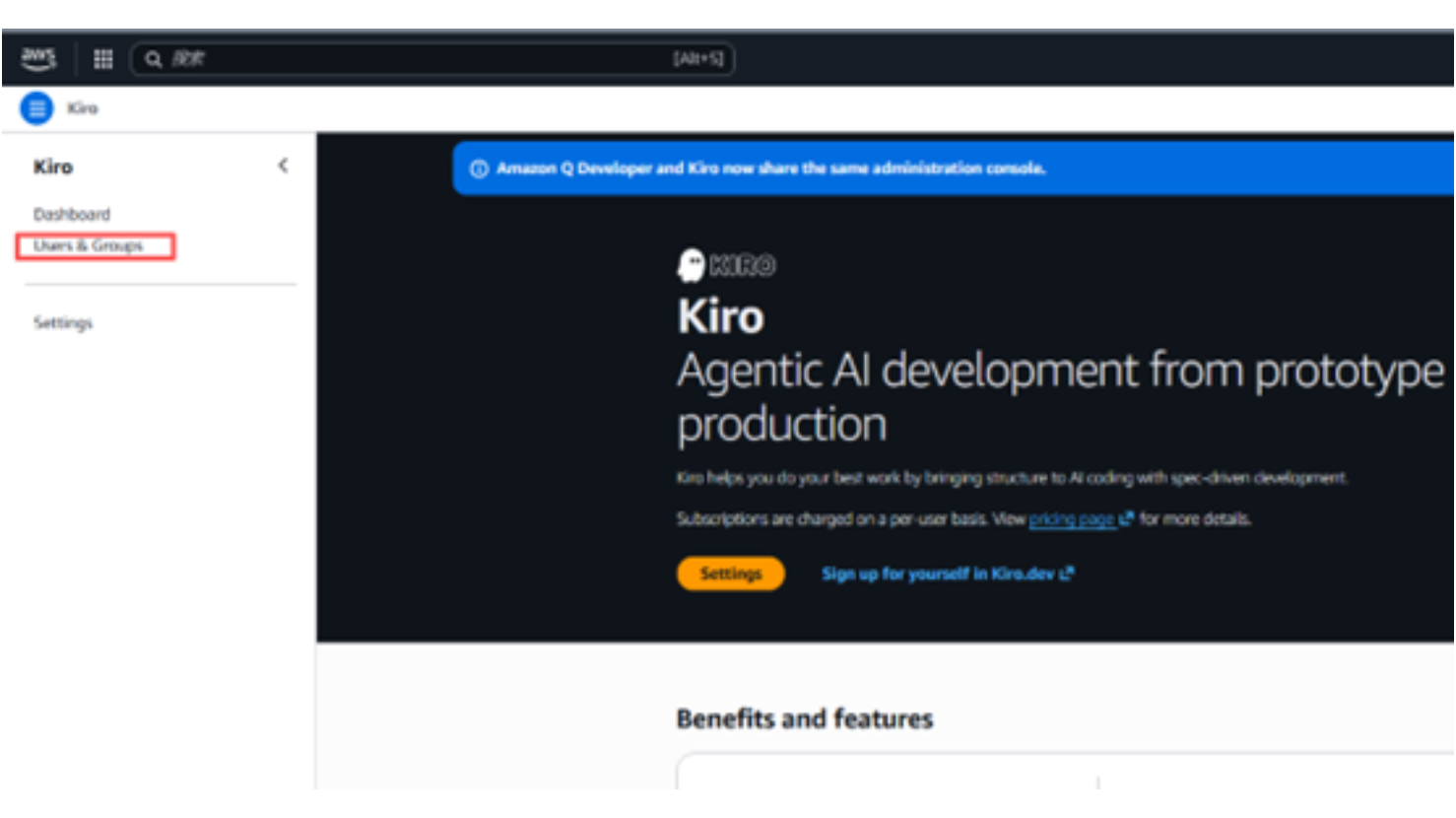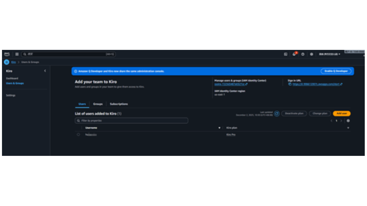 - AWS IAM Identity Center:您需要在您的 IAM Identity Center,包含订阅的 kiro 用户身份,您的 IAM 身份中心实例必须位于支持的 AWS 区域内;