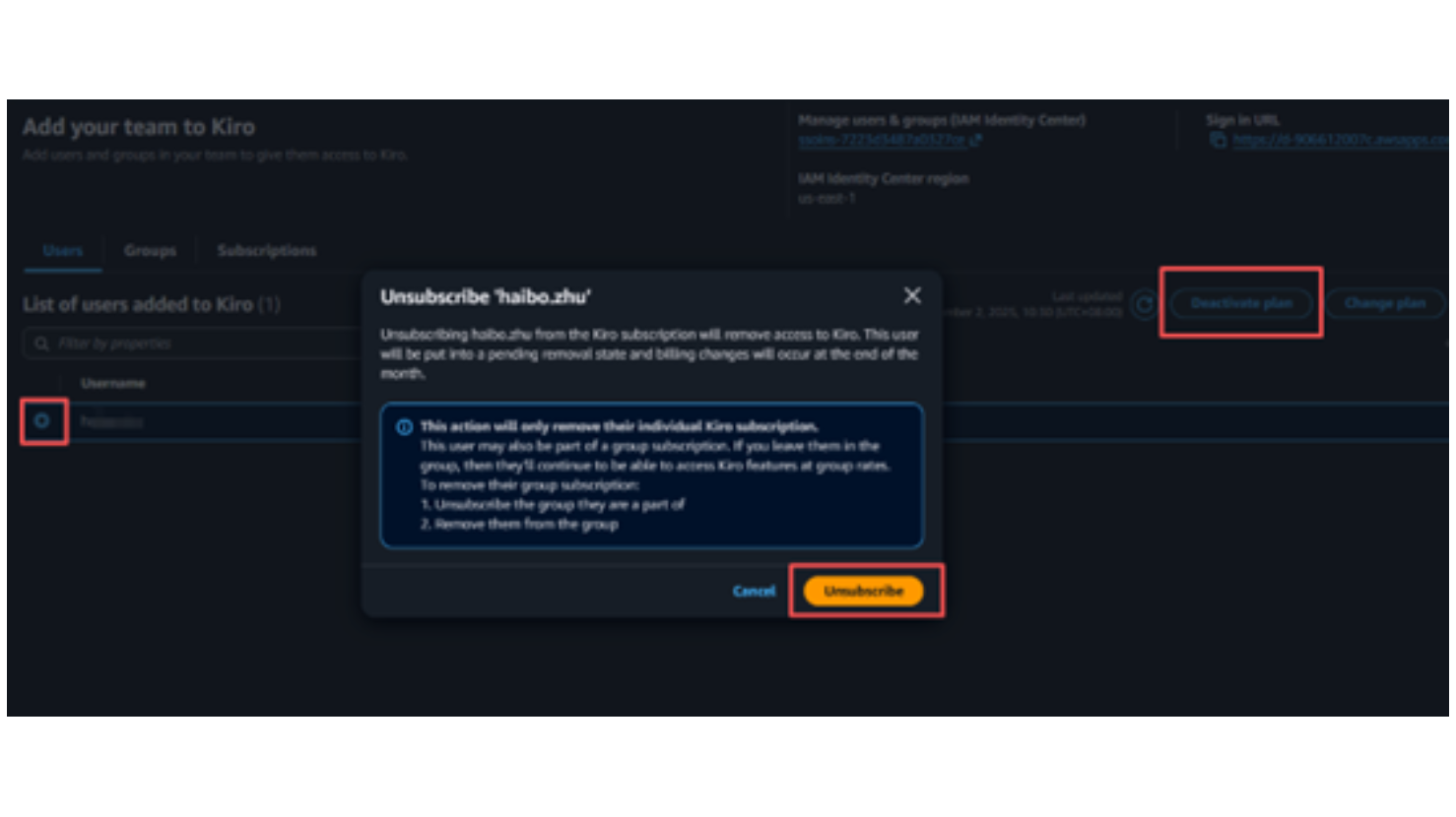 勾选需要退订的用户,然后选择“Deativate Plan”再点击“Unsubscribe”即可为该用户退订