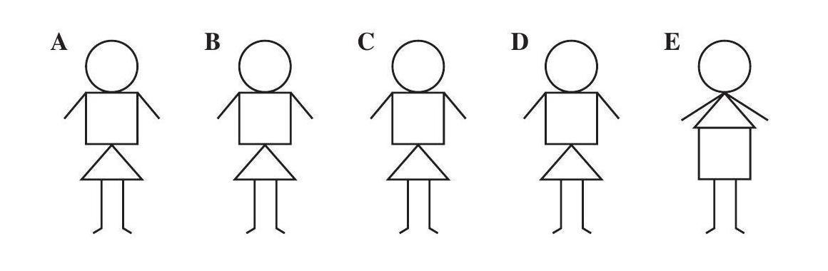 The figure labeled E is the only one with a different shape for the skirt. The other figures have triangular skirts, while figure E has a rectangular skirt.