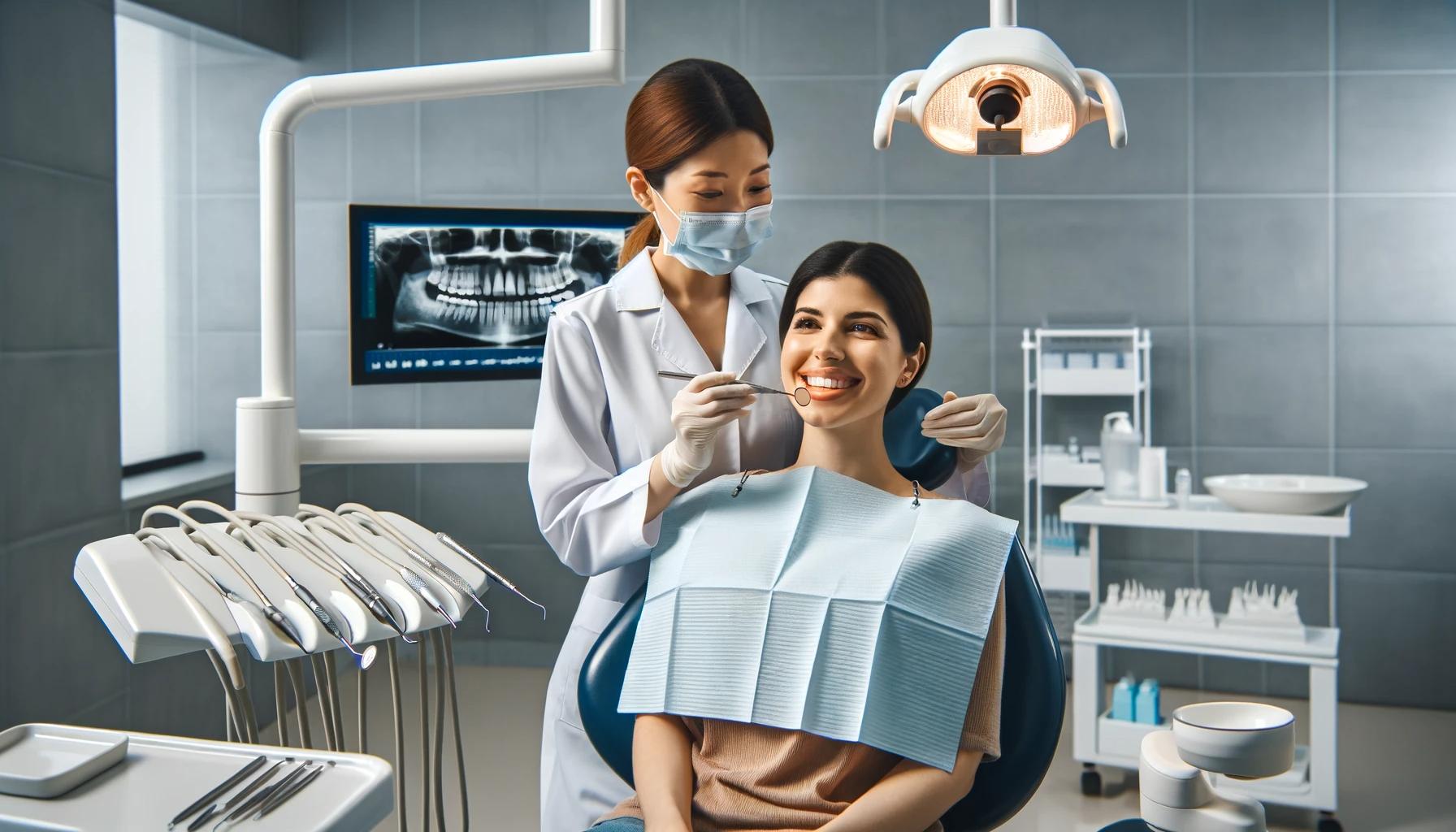 The image shows a young woman sitting in a dentist's chair, with a female dentist examining her teeth. The woman is wearing a bib to protect her clothes from any water or other substances that may be used during the examination. The dentist is wearing a white lab coat and a mask, and she is holding a dental mirror and a probe. The background of the image is a dental office, with various dental tools and equipment visible.