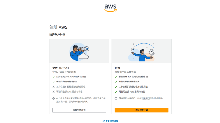 免费计划允许您在没有任何成本的情况下试用 AWS 服务,并在最长 6 个月的时间内构建概念验证,直到您升级至付费计划为止。