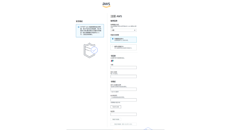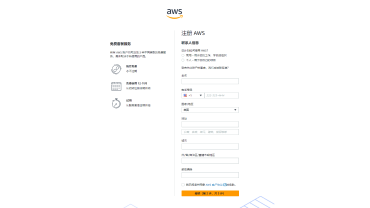 *注意:需使用英文/拼音填写您的个人或企业信息。对于企业亚马逊云科技账户,最佳实践是输入公司电话号码而不是个人手机号码。使用个人电子邮件地址或个人电话号码来配置根账户可能会让您的账户不安全。