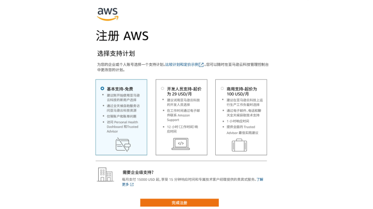 01 在 选择支持计划 页面上,选择一个可用的支持计划。有关可用支持计划及其优势的描述,请参阅 比较亚马逊云科技支持服务计划。