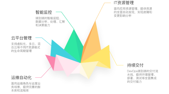优维科技产品EasyOps基于互联网运维的最佳实践和全栈 DevOps 运维平台,面向应用的全生命周期管理。全面支持云管理平台,持续交付、IT资源管理、运维自动化等互联网运维能力。IT资源管理,面向应用资源管理,提供资源的全面自动发现,视线故障和变更影响分析。持续交付,DevOps端到端的交付流水线,提供环境管理、部署、测试等全面集成的交付能力。智能监控,端到端的智能监控、数据分析、处理、汇聚和决策能力。运维自动化,面向运维角色与运维业务场景,提供完善的校本库和流程库。云平台管理,支持虚拟化、多云、混合云等不同IT资源模式的生命周期管理。