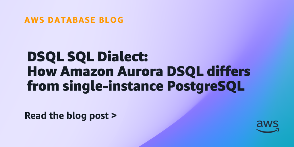 This post is for database architects, developers, and DBAs who must evaluate Amazon Aurora DSQL or work with PostgreSQL workloads on a distributed database. Knowing exactly where Amazon Aurora DSQL aligns with standard PostgreSQL and where it diverges helps you to reduce risk and design schemas that perform well from day one. You might find that most existing PostgreSQL applications work with minimal changes.