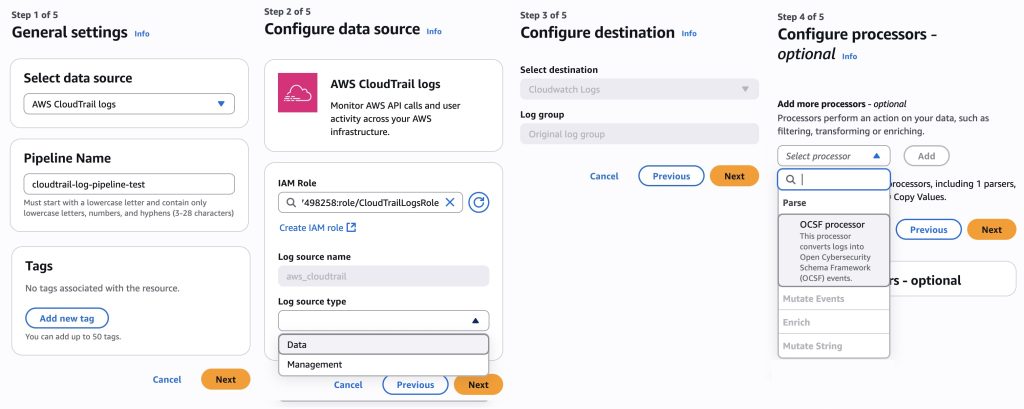 - Optimierung der Datenaufnahme und Normalisierung – CloudWatch sammelt automatisch AWS-bereitgestellte Logs über Konten und AWS-Regionen hinweg und integriert sich mit AWS Organizations von AWS-Services einschließlich AWS CloudTrail, Amazon Virtual Private Cloud (Amazon VPC) Flow Logs, AWS WAF Access Logs, Amazon Route 53 Resolver Logs und vorgefertigten Konnektoren für Drittanbieterquellen wie Endpoint (CrowdStrike, SentinelOne), Identität (Okta, Entra ID), Cloud-Sicherheit (Wiz), Netzwerksicherheit (Zscaler, Palo Alto Networks), Produktivität und Zusammenarbeit (Microsoft Office 365, Windows Event Logs und GitHub) sowie IT-Service-Manager mit ServiceNow CMBD. Um Ihre Daten während der Aufnahme zu normalisieren und zu verarbeiten, bietet CloudWatch verwaltete OCSF-Konvertierung für verschiedene AWS- und Drittanbieter-Datenquellen sowie andere Prozessoren wie Grok für benutzerdefiniertes Parsing, Operationen auf Feldebene und String-Manipulationen.
