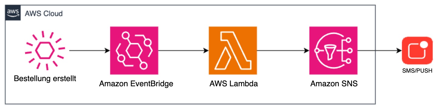 Ohne EventBridge Pipes würde dies mit EventBridge implementiert werden, um auf das Bestellereignis zu reagieren. Alle Ereignisse werden an eine eigene Lambda-Funktion zur Verarbeitung gesendet. Wenn die Bestellung die richtigen Bedingungen erfüllt, sendet die Lambda-Funktion eine Benachrichtigung mit dem Rabattcode an den Kunden über Amazon Simple Notification Service (Amazon SNS).