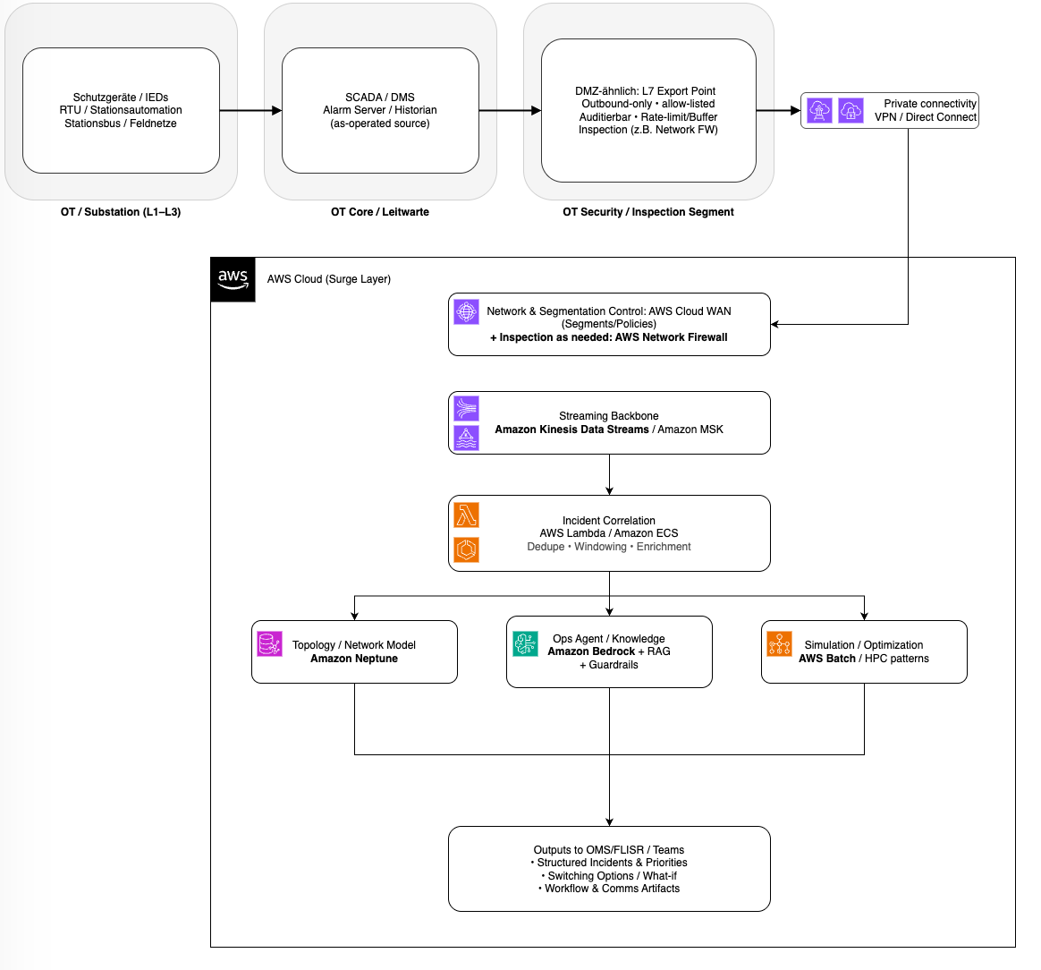 In AWS absorbiert ein Streaming-Backbone wie Amazon Kinesis Data Streams (oder Amazon MSK) die Lastspitzen. Korrelationsservices auf AWS Lambda oder Amazon ECS deduplizieren und korrelieren daraus kontextangereicherte Incidents, die als strukturierte Objekte an OMS/FLISR und nachgelagerte Workflows gehen. Ergebnis: OMS/FLISR bekommen priorisierte Incident-Objekte statt Meldungsflut – und kommen schneller von Alarmen zu sicheren Maßnahmen.