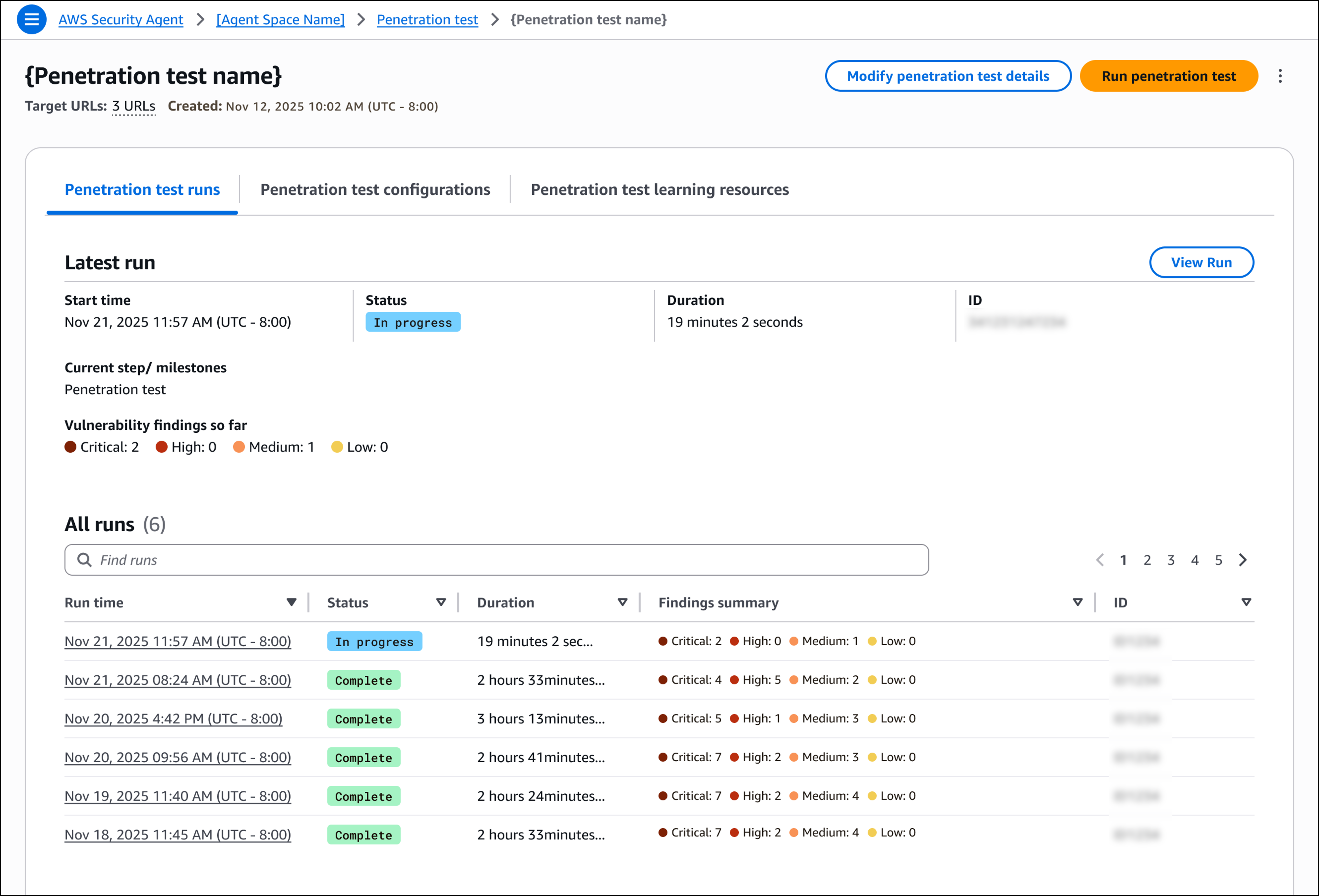 Nach dem Erstellen und Ausführen eines Penetrationstests bietet die Detailseite einen Überblick über die Testausführung und Ergebnisse. Sie können neue Tests ausführen oder die Konfiguration von dieser Seite aus ändern. Die Seite zeigt Informationen über die letzte Ausführung an, einschließlich Startzeit, Status, Dauer und einer Zusammenfassung der entdeckten Schwachstellen, kategorisiert nach Schweregrad. Sie können auch einen Verlauf aller vorherigen Testläufe mit ihren Ergebniszusammenfassungen anzeigen.