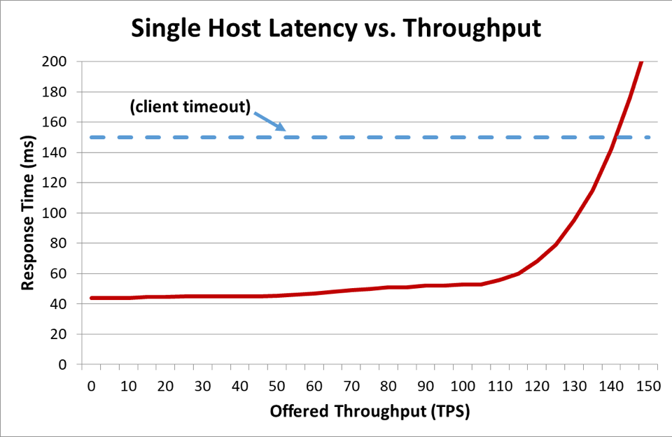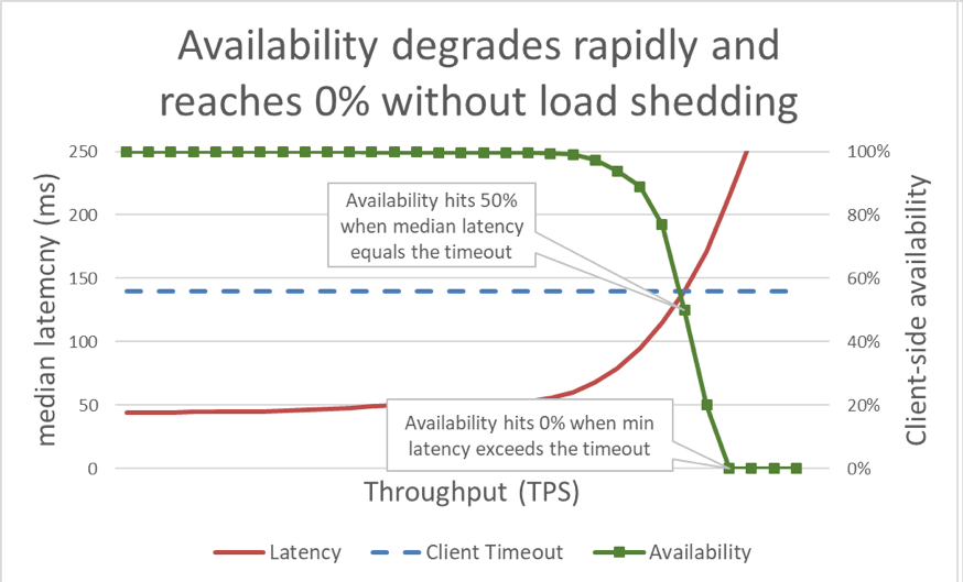 In a distributed system where a client is talking to a server, the client typically becomes impatient and stops waiting for the server to respond after some time. This duration is known as a timeout. When a server gets so overloaded that its latency exceeds its client’s timeout, requests start to fail. The following graph shows how server response time increases as offered throughput (in transactions per second) increases, and response time eventually reaches an inflection point where things deteriorate quickly.