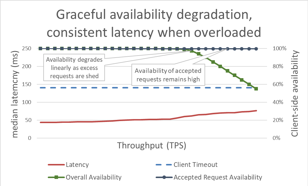 During tests, we make sure to measure client-perceived availability and latency in addition to server-side availability and latency. When client-side availability begins to decrease, we push the load far beyond that point. If load shedding is working, goodput will remain steady even as offered throughput increases well beyond the scaled capabilities of the service.