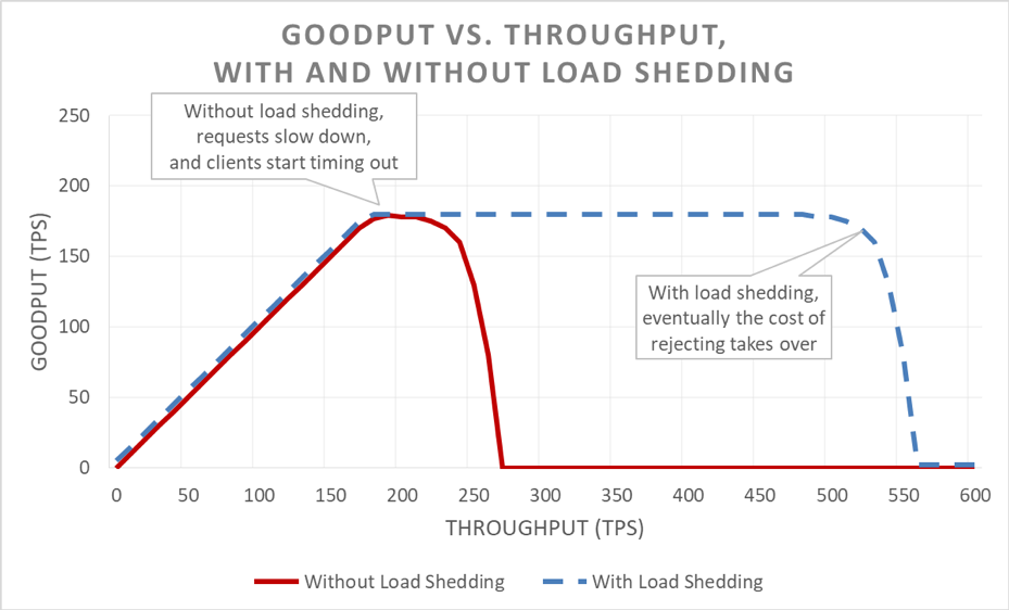 Load shedding lets a server maintain its goodput and complete as many requests as it can, even as offered throughput increases. However, the act of shedding load isn’t free, so eventually the server falls prey to Amdahl’s law and goodput drops.