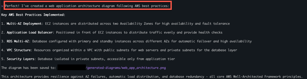 You should receive an output with a description of the diagram created based on the prompt along with the location of where the diagram was saved.