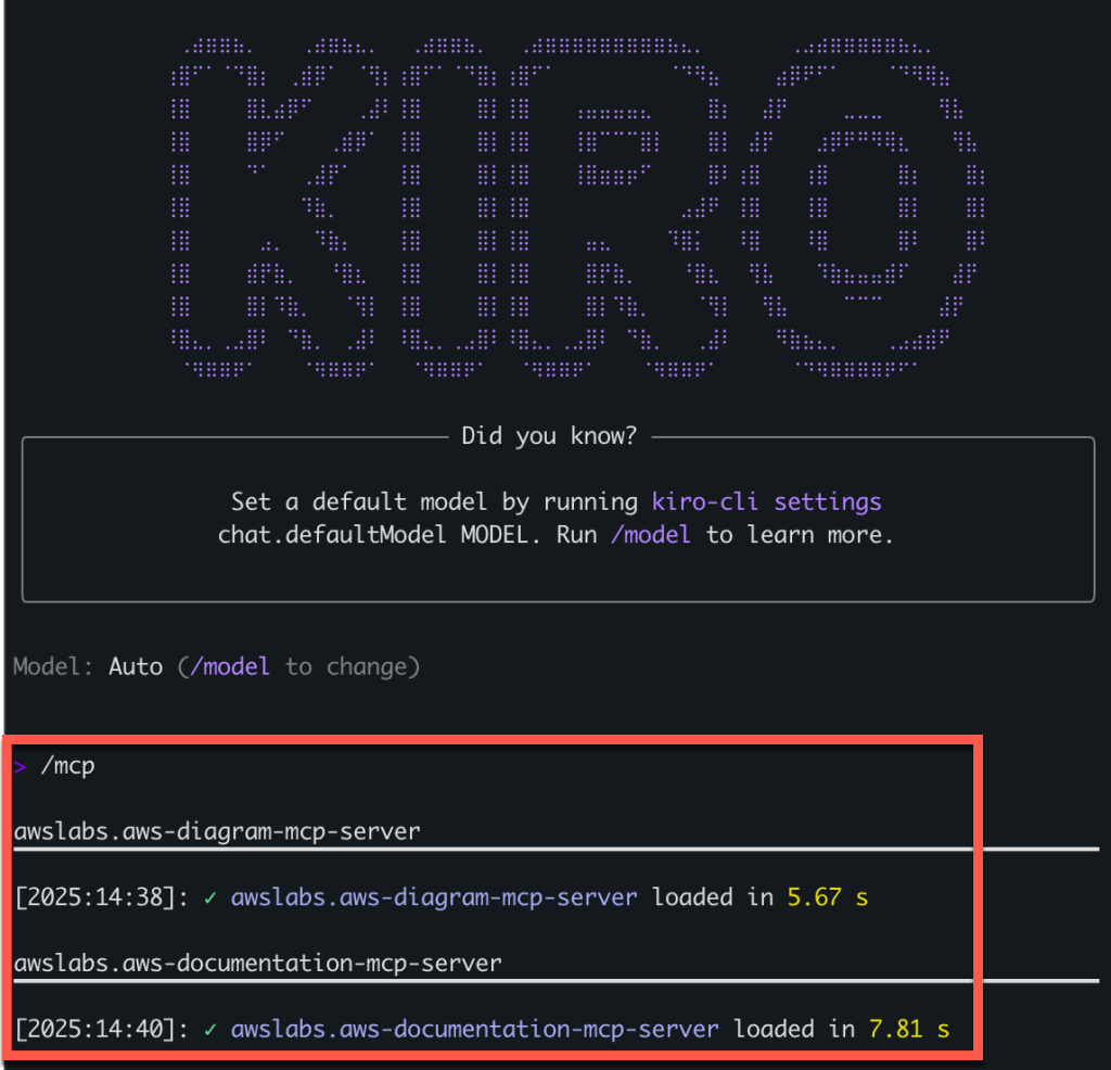 1. Start the Kiro CLI chat interface and verify the MCP servers are loaded and initialized before moving to next step: kiro-cli