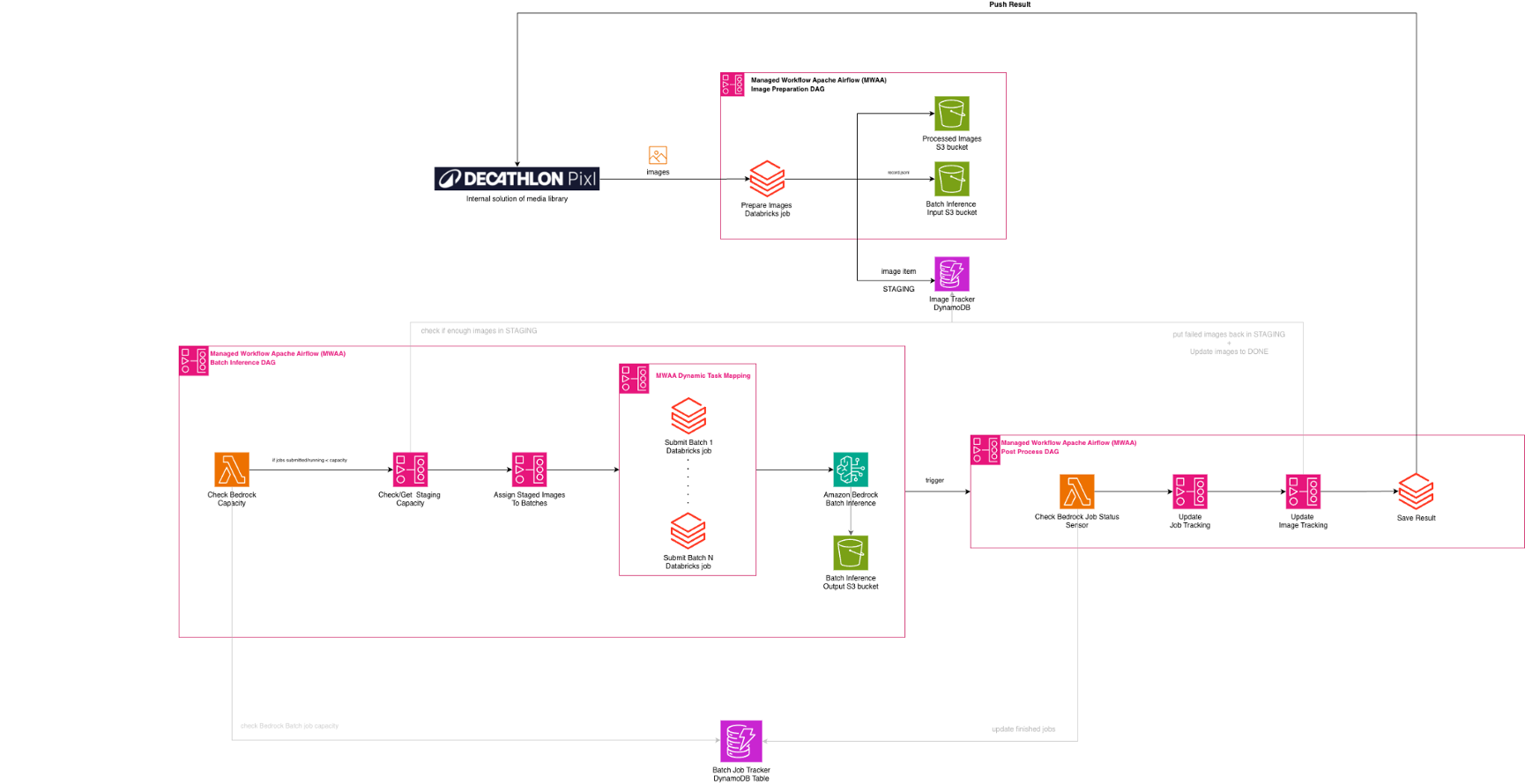 L’orchestration du workflow s’appuie sur Apache Airflow via Amazon Managed Workflows for Apache Airflow (MWAA) pour coordonner le processus multi-étapes. Le système gère automatiquement les images en attente, crée des lots d’inférence, soumet les traitements à Amazon Bedrock batch inference et déclenche le post-traitement par lot dès que les résultats sont disponibles. Cette approche de traitement par lots réduit les coûts de 50% par rapport au traitement en temps réel, tout en permettant de traiter 25 000 images par jour, une capacité ajustable selon les besoins.