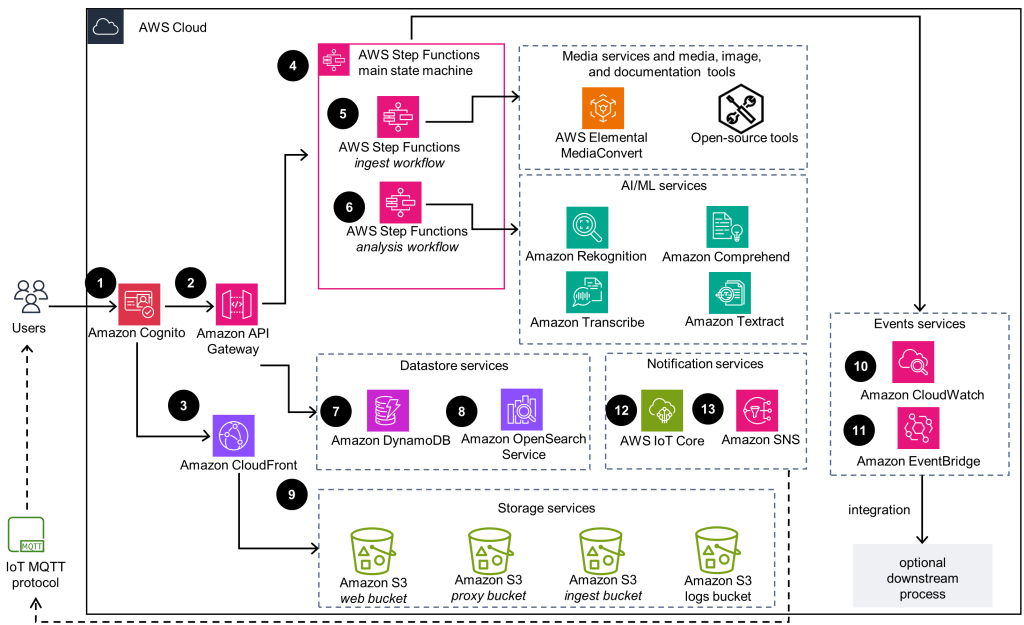 Guidance for Media2Cloud on AWS est une solution serverless complète d’ingestion et d’analyse pour déplacer les assets vidéo et les métadonnées associées vers AWS. Pendant l’ingestion vers le cloud, Media2Cloud analyse les vidéos, images, audios et documents pour extraire des métadonnées précieuses, incluant les informations sur les médias image et vidéo, les transcriptions audio et les informations tabulaires des documents numérisés, alimentées par les services d’intelligence artificielle AWS. Ces métadonnées peuvent être utilisées pour rendre les médias consultables et permettre leur réutilisation à de nouvelles fins. Dans cette dernière version, les métadonnées peuvent également être enrichies en utilisant l’IA générative pour produire des légendes d’images, des résumés de transcription et des classifications de contenu alimentées par Amazon Bedrock.