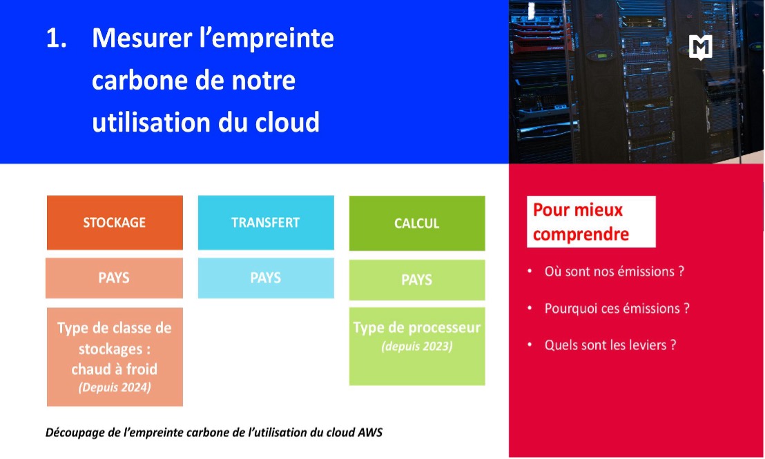 Médiamétrie a établi une cartographie précise de ses émissions cloud pour construire sa stratégie de décarbonation. L’entreprise a collaboré avec AWS et Greenly un prestataire spécialisé dans les bilans carbone, pour analyser trois catégories d’émissions : le stockage des données, le calcul et le transfert réseau. Cette analyse a révélé qu’AWS représentait 7 à 10% des émissions totales de Médiamétrie, créant un levier d’action significatif pour atteindre l’objectif de réduction de 50% d’ici 2030.