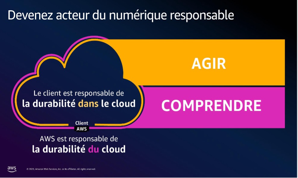 Le modèle de responsabilité partagée s’étend désormais à la durabilité : AWS assure la durabilité du cloud avec son infrastructure, son refroidissement et son énergie renouvelable. Vous êtes responsable de la durabilité dans le cloud par vos choix de services, l’optimisation de votre code et la gestion de vos données. Cette répartition claire permet à Médiamétrie de se concentrer sur l’optimisation de ses architectures.