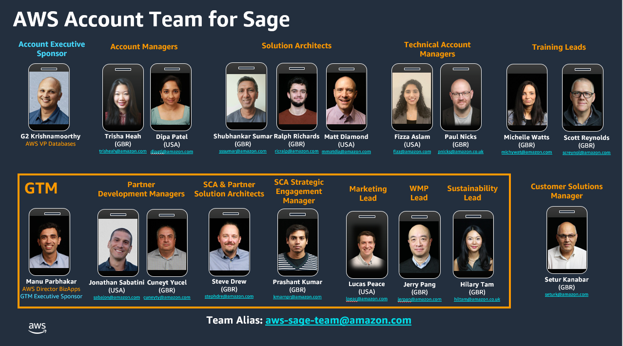 Access technology and structurual guidance, roadmap sessions for Sage solutions, digital and in-classroom training, as well as Amazon methodlogies like Working Backwards and Art of the Possible.