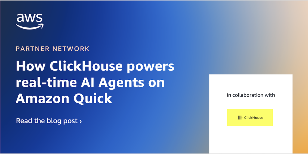 Real-time AI agents are transforming how businesses make decisions—but only when they can access analytical data at conversational speed. This post shows you how to integrate ClickHouse Cloud with Amazon Quick using Model Context Protocol (MCP), delivering sub-second query responses across billions of data points. Learn how to empower your teams with natural language access to live operational data, enabling instant insights and actions without writing a single line of SQL.