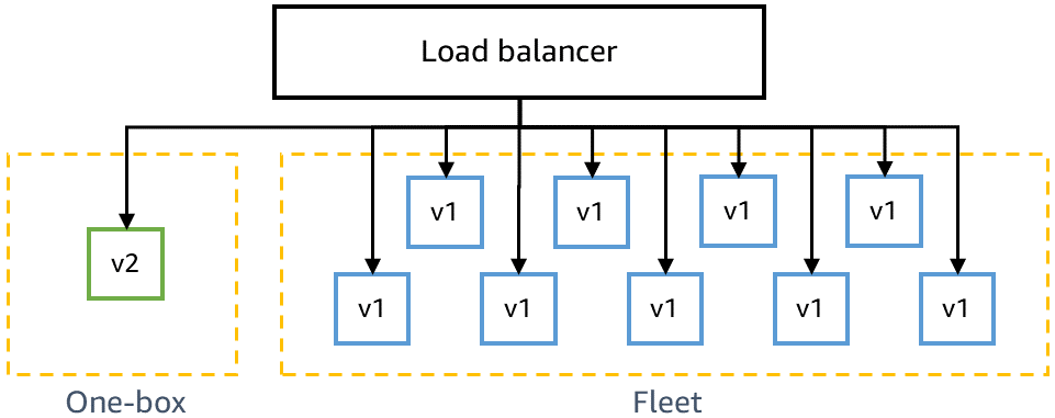 Before deploying to production, we need to ensure that the latest code is backward-compatible and can be safely deployed alongside the current code. For example, we need to detect whether the latest code writes data in a format that the current code can’t parse. The one-box stage in gamma deploys the latest code to the smallest unit of deployment, such as to a single virtual machine or single container, or to a small percentage of AWS Lambda function invocations. This one-box deployment leaves the rest of the gamma environment deployed with the current code for some period of time, such as 30 minutes or one hour. Traffic doesn’t have to be specially driven to the one box. It can be added to the same load balancer or poll the same queue as the rest of the gamma environment. For example, in a gamma environment of ten containers behind a load balancer, the one box receives ten percent of the gamma traffic generated by continuous canary tests. The one-box deployment monitors canary test success rates and service metrics to detect any impact from the deployment or from having a “mixed” fleet deployed side by side.