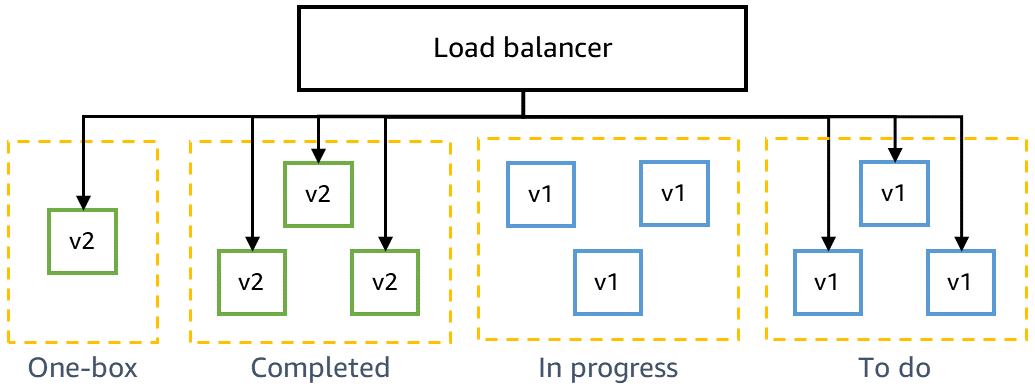 The following diagram shows the state of a production environment in the middle of a rolling deployment. The new code has been deployed to the one-box stage and to the first batch of the main prod fleet. Another batch has been removed from the load balancer and is being shut down for replacement.