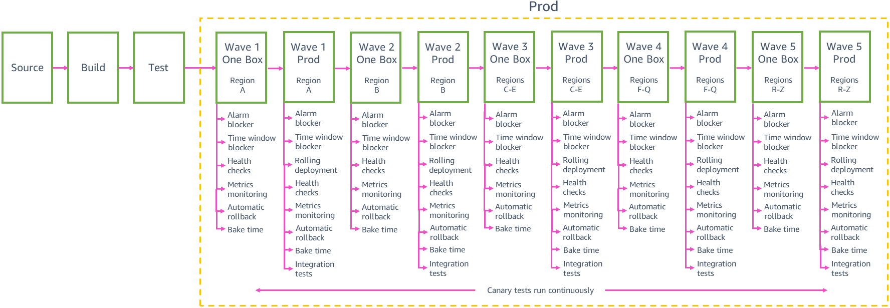 Each team needs to balance the safety of small-scoped deployments with the speed at which we can deliver changes to customers in all Regions. Deploying changes to 24 Regions or 76 Availability Zones through the pipeline one at a time has the lowest risk of causing broad impact, but it could take weeks for the pipeline to deliver a change to customers globally. We have found that grouping deployments into “waves” of increasing size, as seen in the previous sample prod pipeline, helps us achieve a good balance between deployment risk and speed. Each wave’s stage in the pipeline orchestrates deployments to a group of Regions, with changes being promoted from wave to wave. New changes can enter the production phase of the pipeline at any time. After a set of changes is promoted from the first step to the second step in wave 1, the next set of changes from gamma is promoted into the first step of wave 1, so we don’t end up with large bundles of changes waiting to be deployed to production.