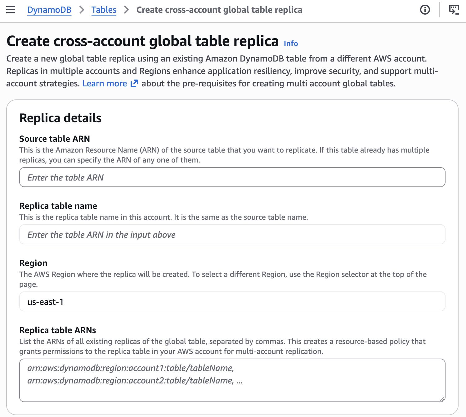 - ACCOUNT1_TABLE_ARN: “arn:aws:dynamodb:REGION1:ACCOUNT1:table/myTable”