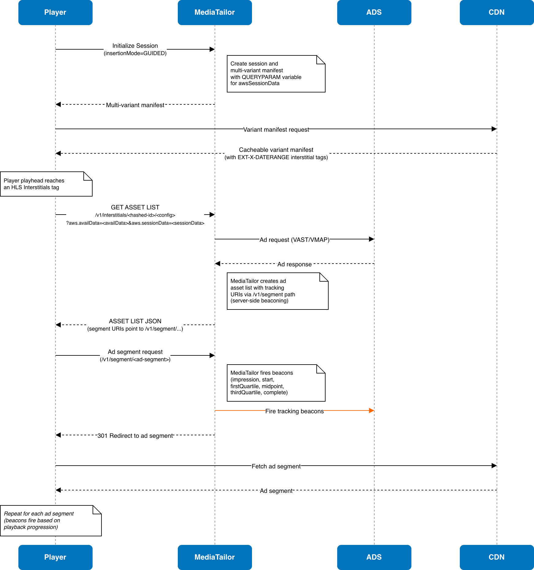 EXT-X-DATERANGEtag and requests theASSET-LISTfrom MediaTailor. In turn, this can facilitate reduced load on the ADS and improved render rates if viewers drop from the stream prior to the end of the play-out. - Flexibility and Session State – Currently, device support for HLS Interstitials is not widespread and some devices may never be fully compatible, so MediaTailor supports a hybrid ad insertion mode that allows customers to designate SSAI or SGAI, on a per session basis.
