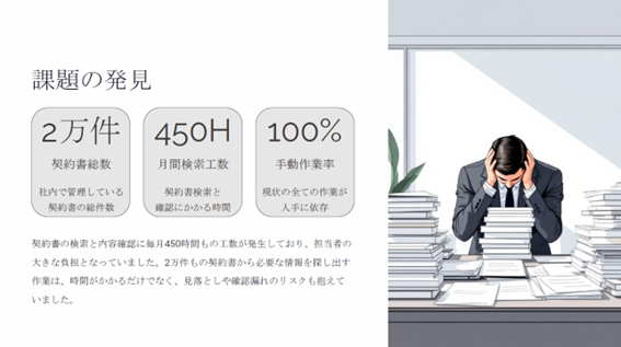 - 契約書の検索が手作業に依存しており、必要な情報を見つけるために複数の PDF を開いて目視で確認する必要がある