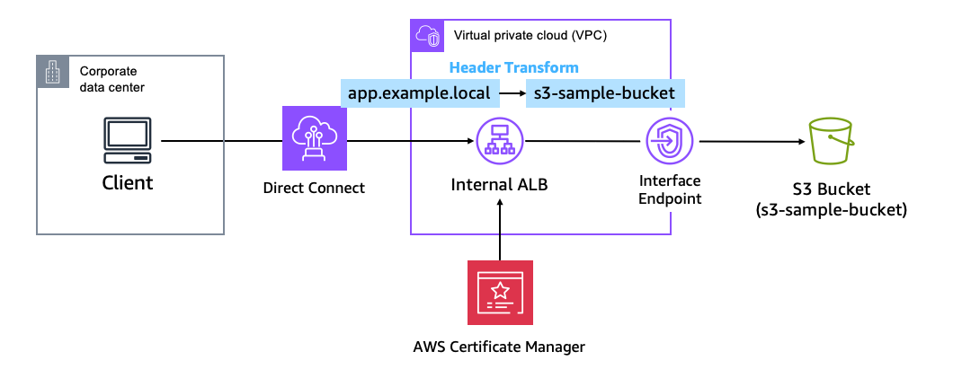 ALB にアクセスした際、リクエストのホストヘッダーには通常、ALB 側で設定されたカスタムドメイン名が含まれます。一方、S3 の Interface Endpoint ではホストヘッダーを元にアクセス先のバケットを特定します。