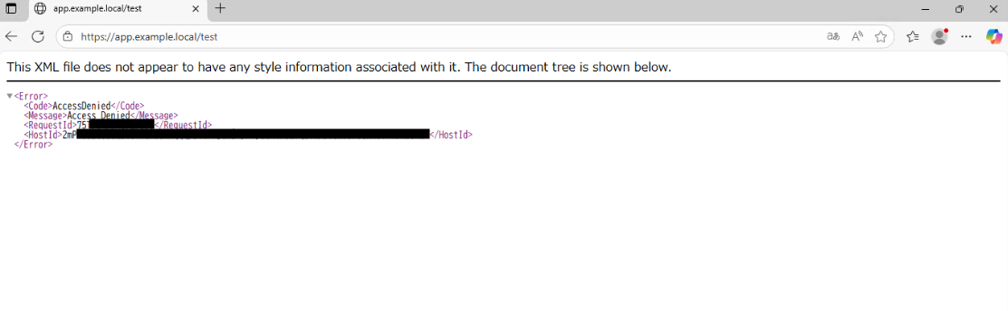 ただし、ハッシュを利用したルーティングを利用している場合でも、存在しない URL へ直接アクセスした場合(例: app.example.local/test)は XML のエラーが表示される点には注意が必要です。